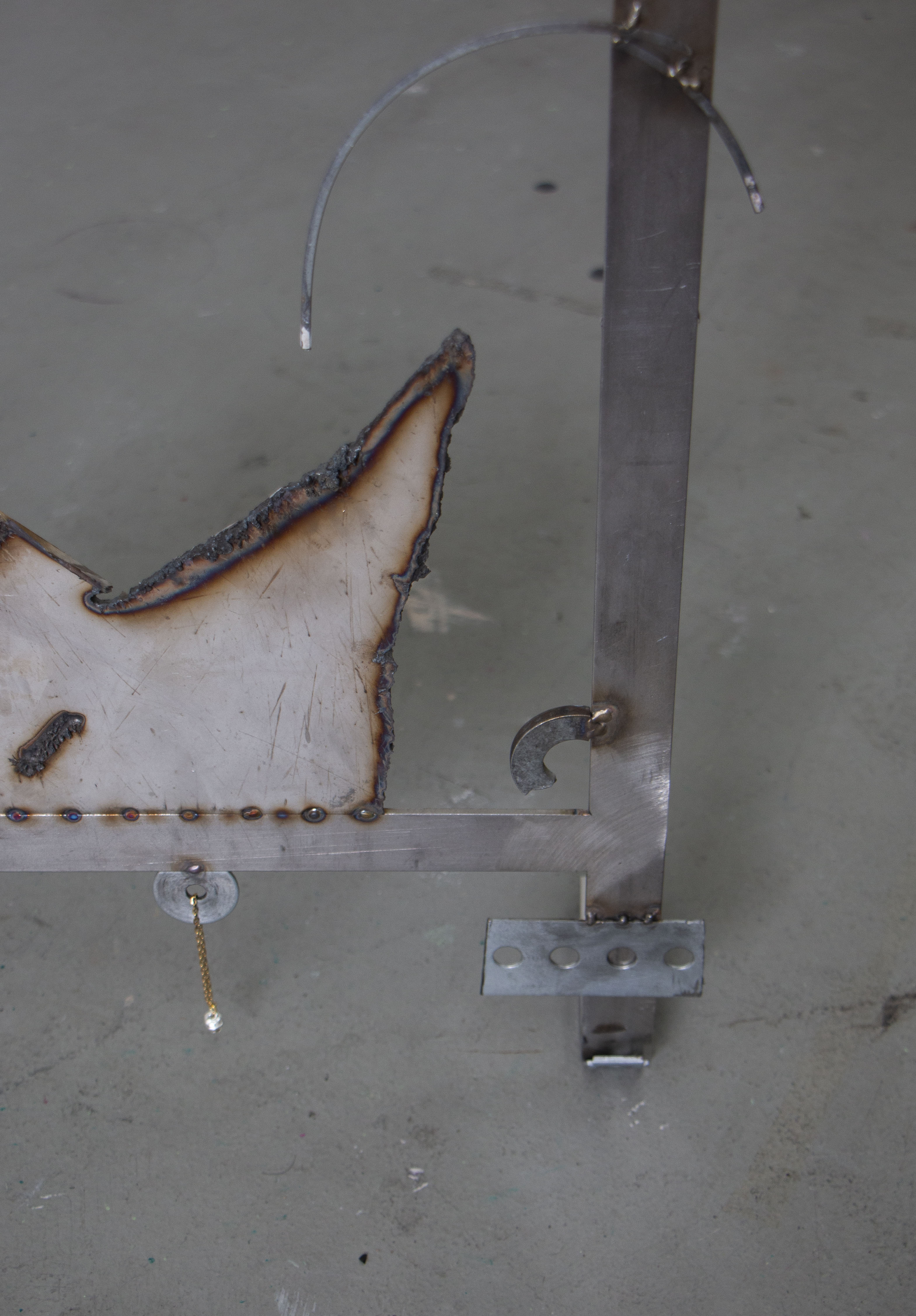 Found and scrap metals, handmade glass orb, shark teeth, one bindi and one bell