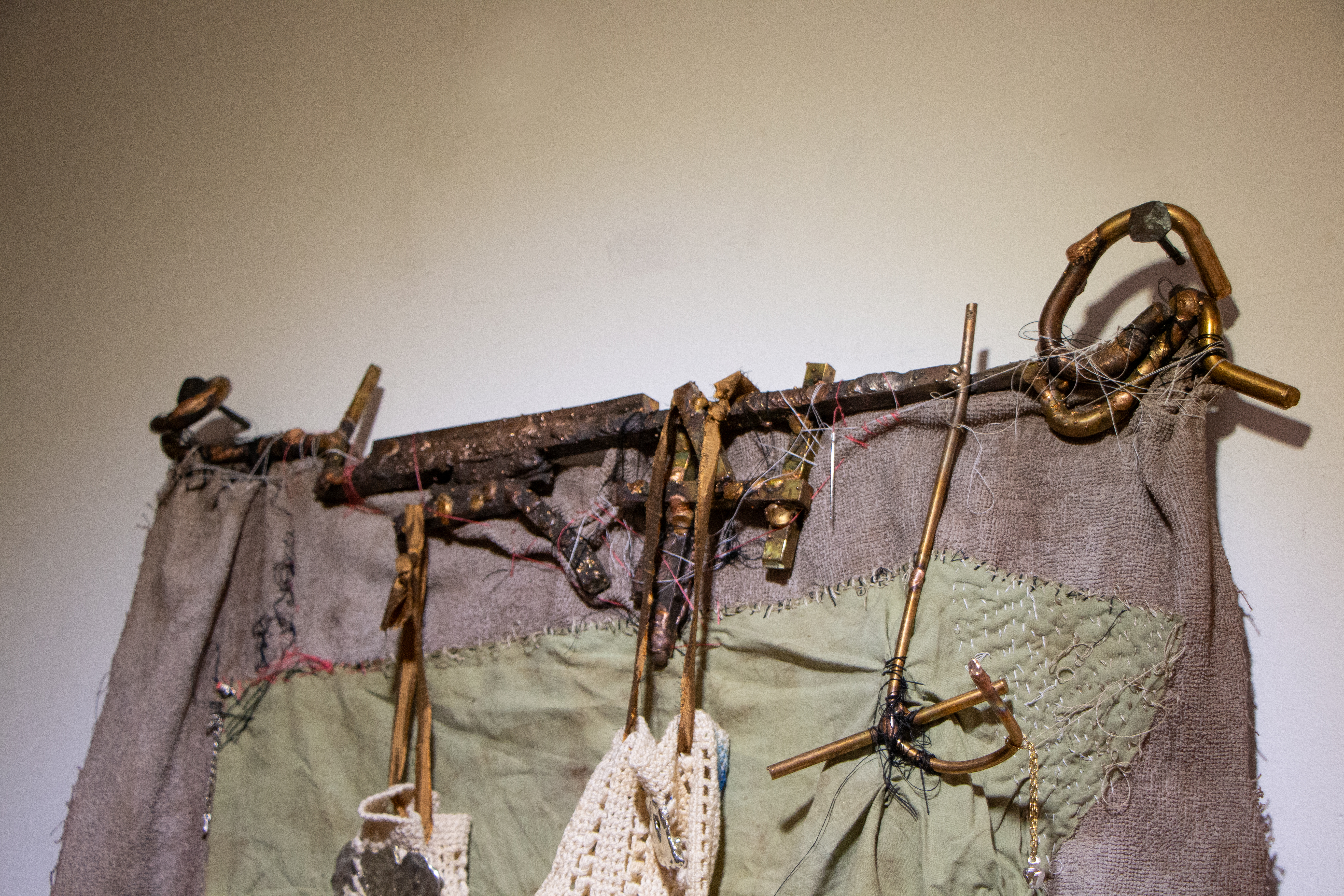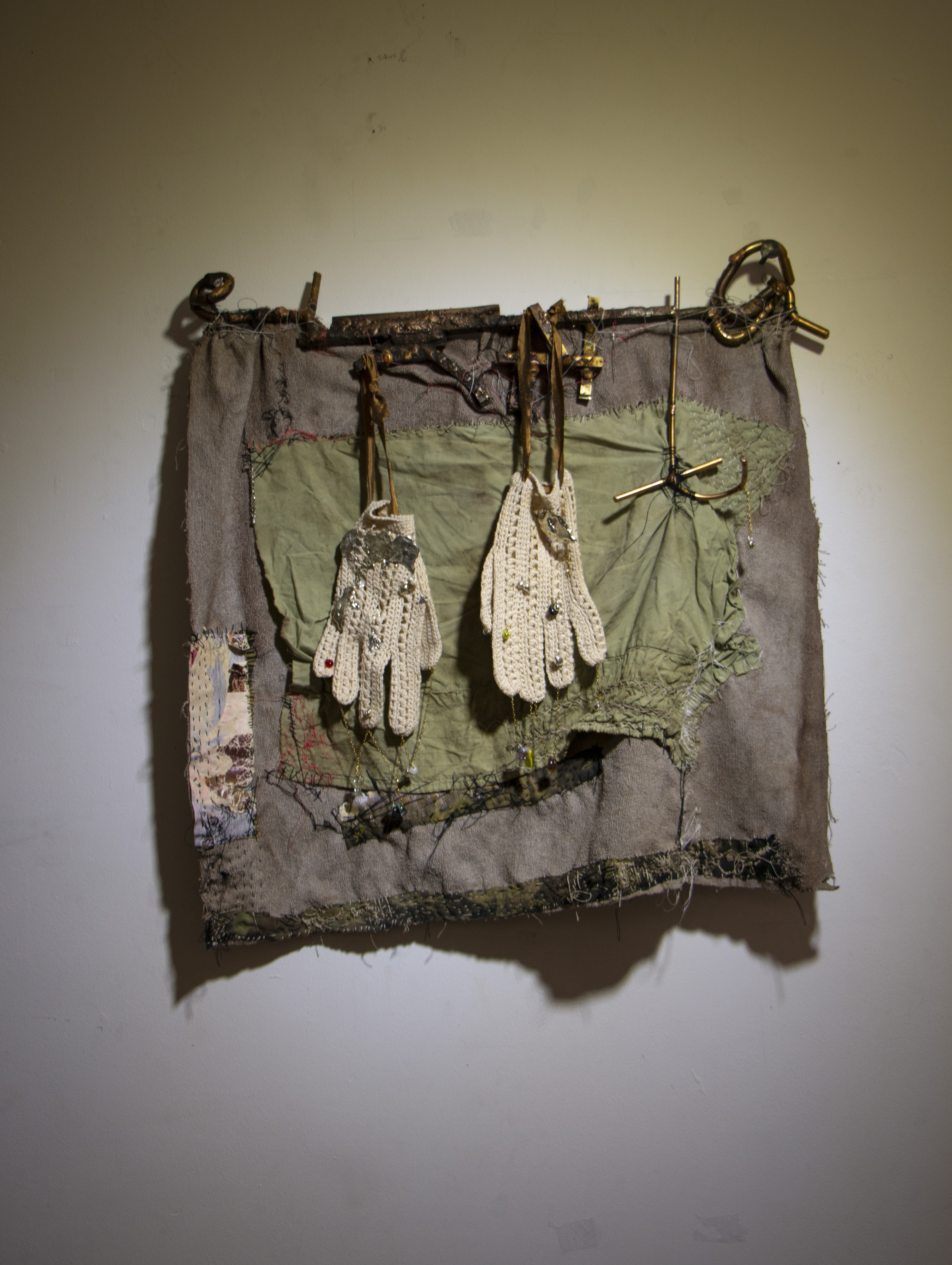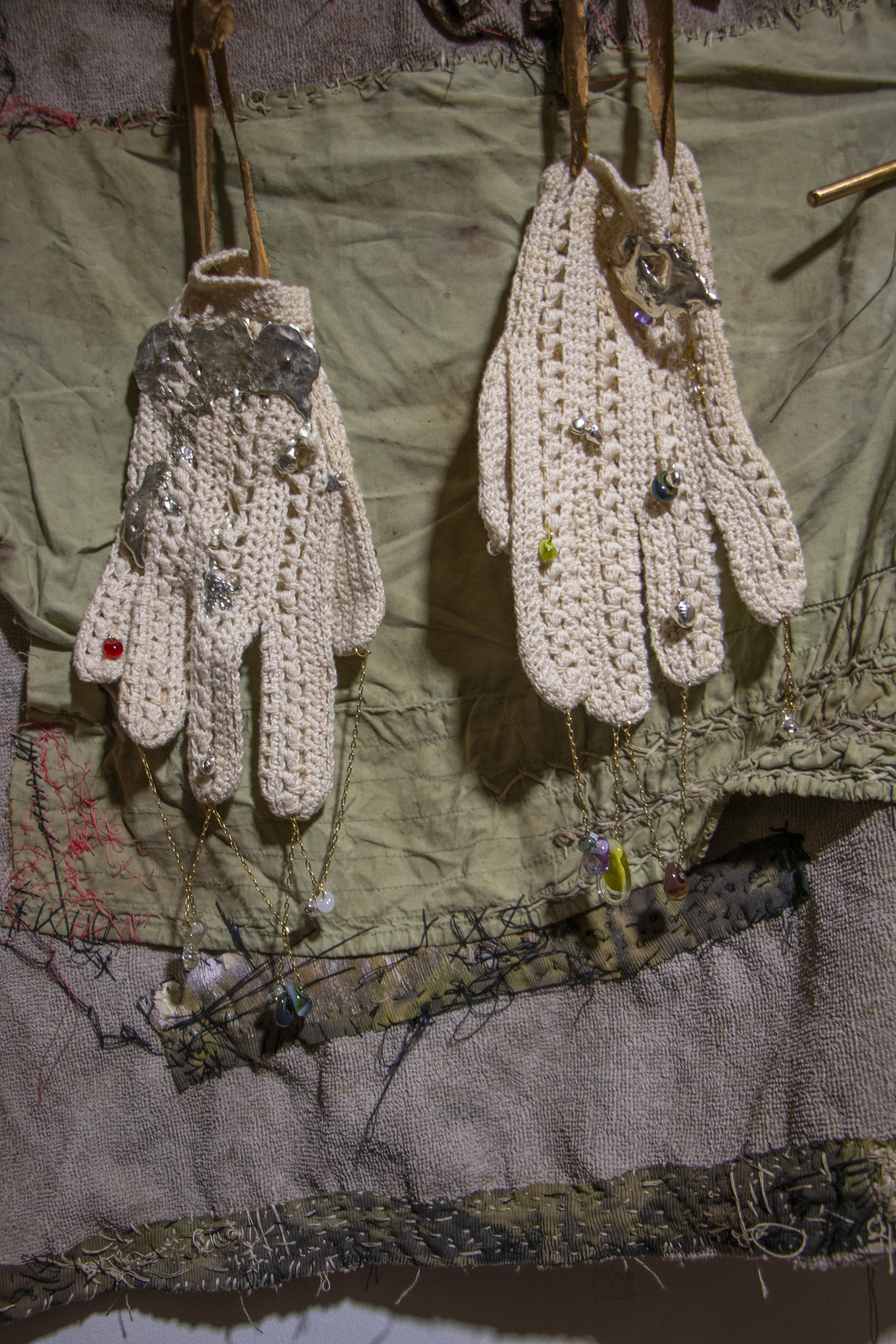 Hand dyed and stitched fibers, bronze, tin, handmade glass beads, bell, vintage gloves