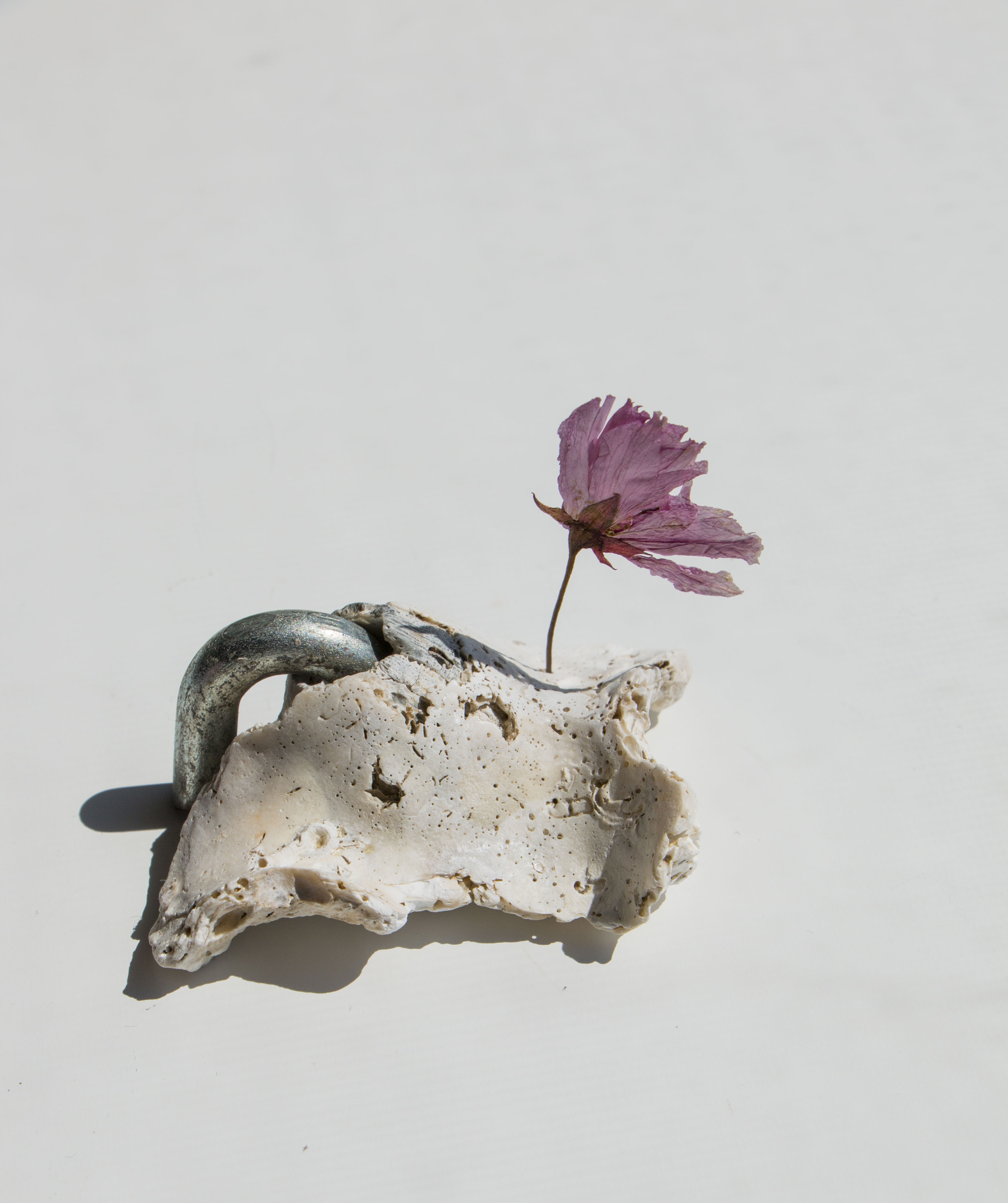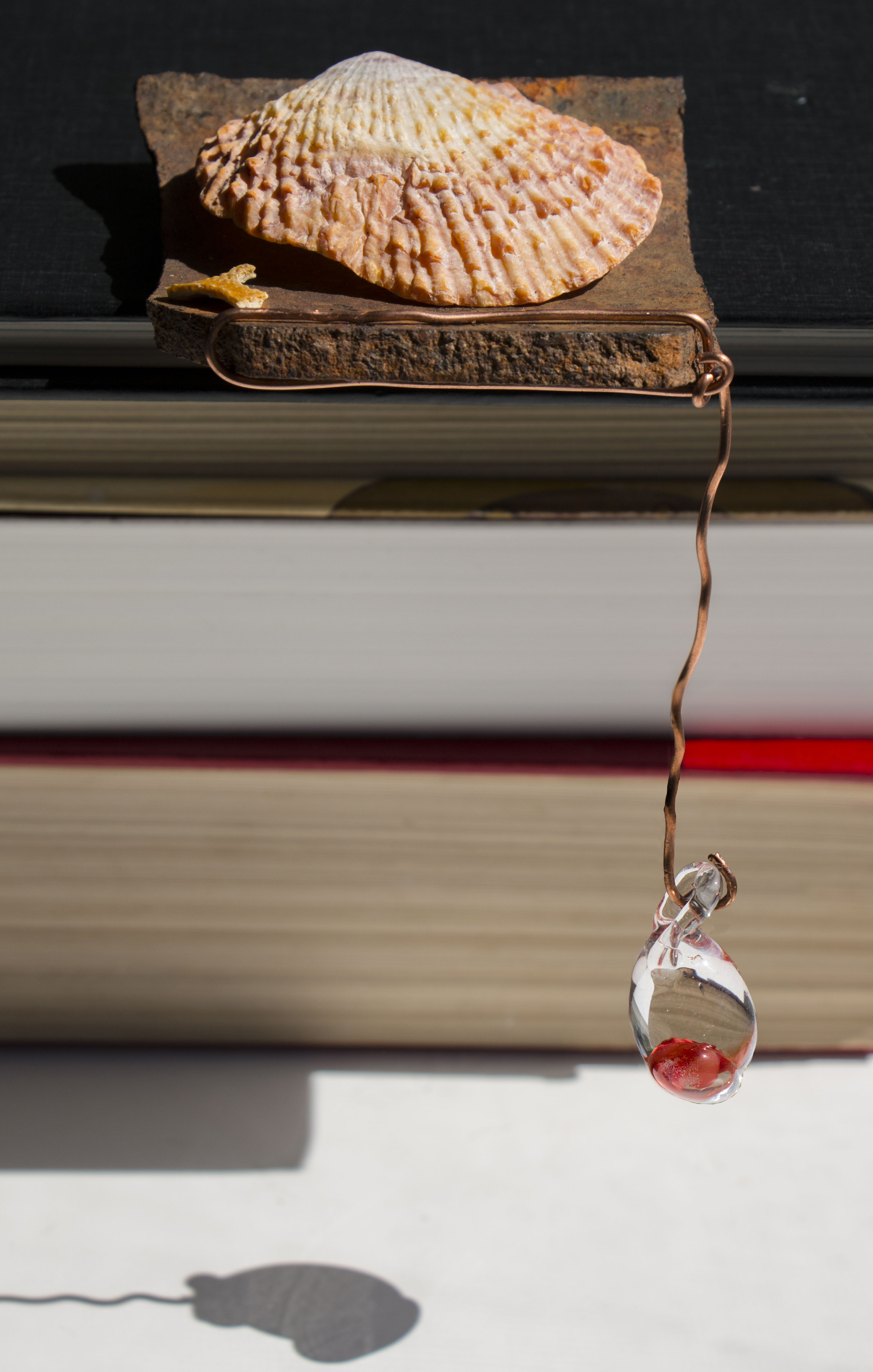 A series of found objects, shells, glass, copper, flowers, orange peels, and bones