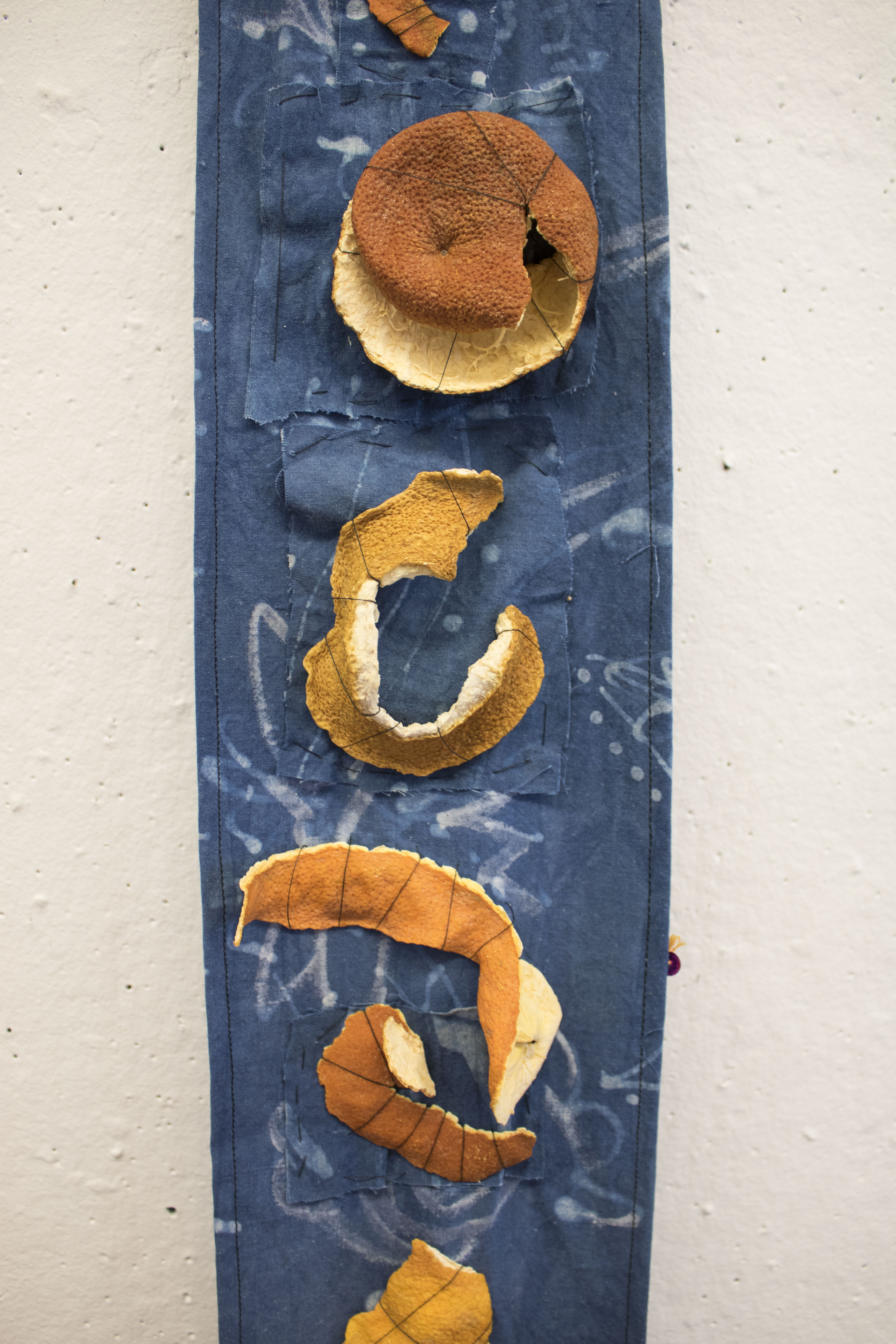 dried orange peels sewn onto fabric dyed in indigo with wax batik work