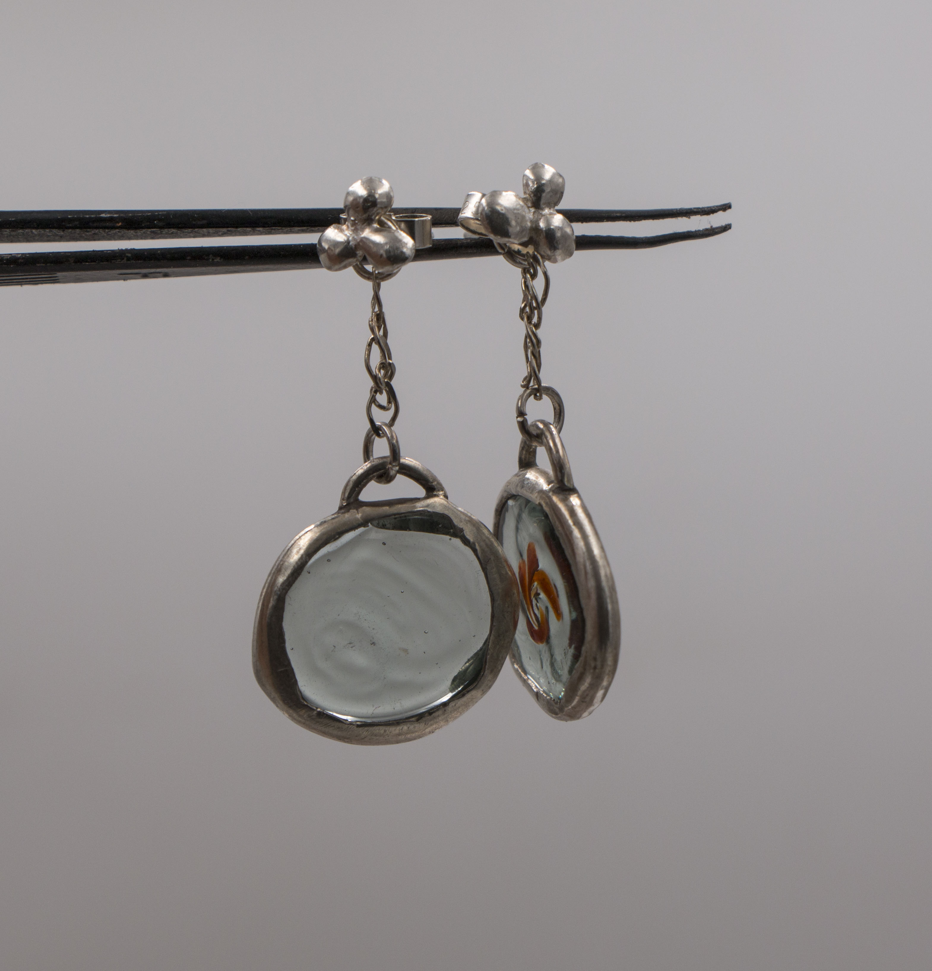 Sterling silver studs and clear glass with red signature spinning flower design bezeled in silver, hanging from sterling silver nonna chain.